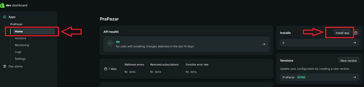 - Uygulamamızı oluşturduktan sonra sol menüden "Home" kısmına tıklıyoruz. Açılan sayfadan "Instal App" kısmına tıklıyoruz.