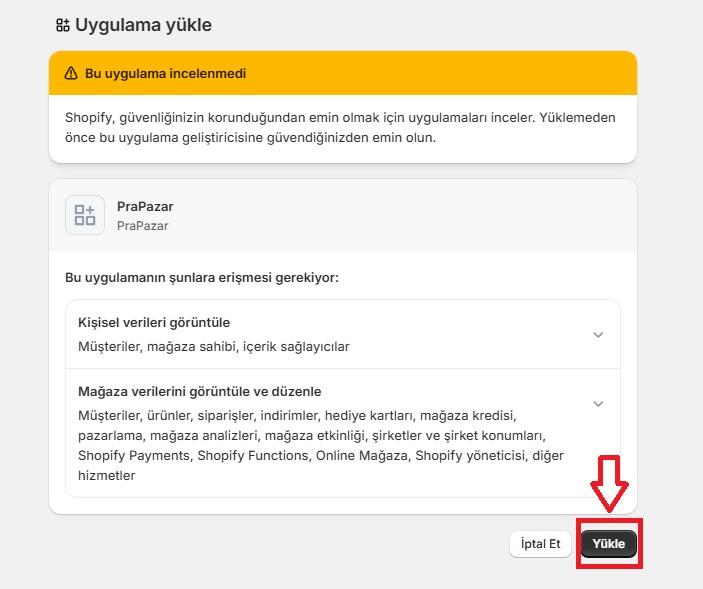 Açılan ekranda "Yükle" kısmına tıklayarak mağazamıza oluşturduğumuz uygulamayı entegre ediyoruz.