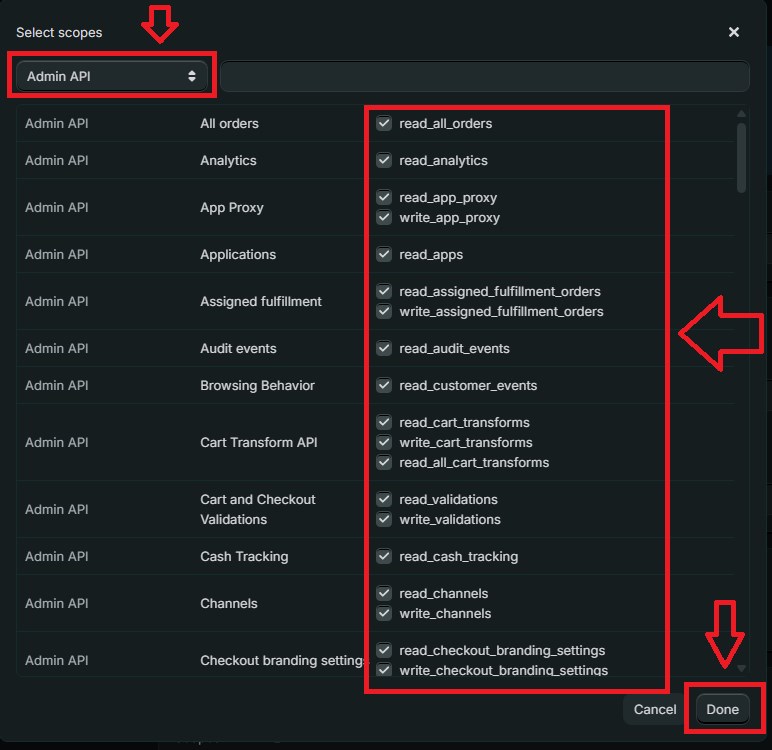 - Açılan pencereden Select scopes altındaki seçenek kısmından Admin API seçeneğini seçerek uygulamamız için tüm yetkilendirmleri vermeniz gerekiyor. Yetkilendirmeleri verdikten sonra "Done" butonuna tıklamamız gerekiyor.