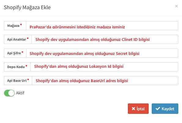 ♦ Açılan sekmede Shopifydan almış olduğunuz bilgileri girerek mağazanızı PraPazar' a bağlamış olursunuz.