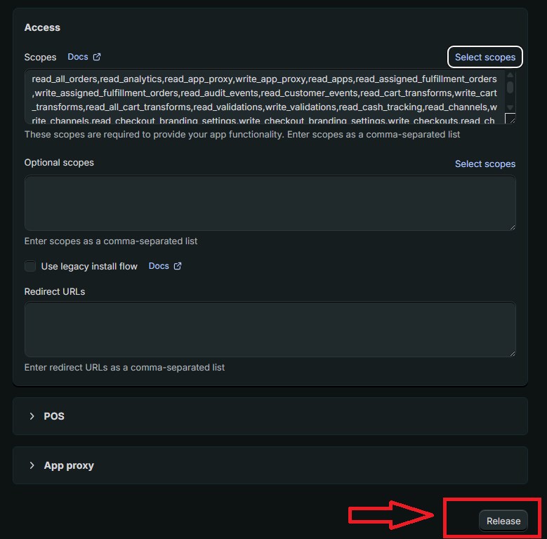 - Açılan ekrandan "Access" altındaki "Select scopes" alanına tıklıyoruz.