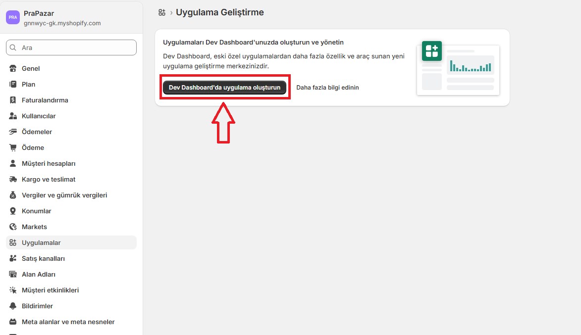 - Açılan sayfa içerisinde "Dev Dashboard'a uygulama oluşturun" seçeneğine tıklıyoruz.